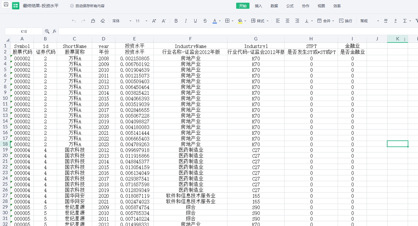 股票代码 | 证券代码 | 股票简称 | 年份 | 投资水平 | 行业名称-证监会2012年版 | 行业代码-证监会2012年版 | 是否发生ST或*ST或PT | 是否金融业 |