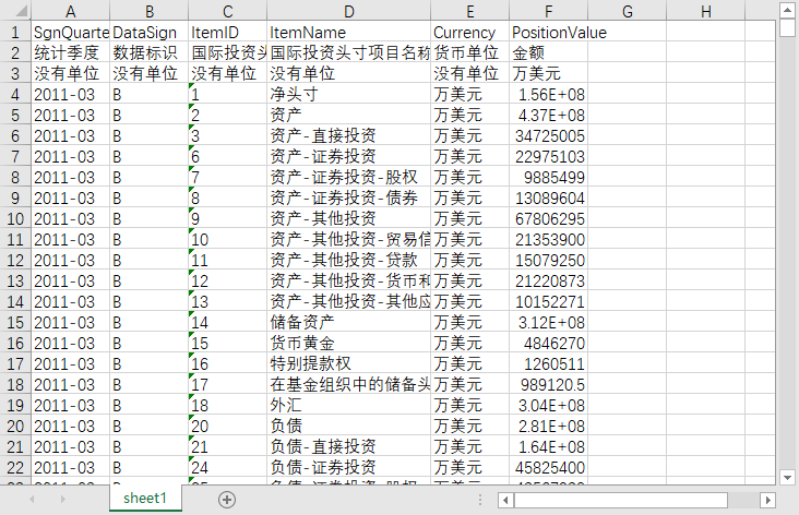 | 统计季度 | 数据标识 | 国际投资头寸项目编码 | 国际投资头寸项目名称 | 货币单位 | 金额 |
