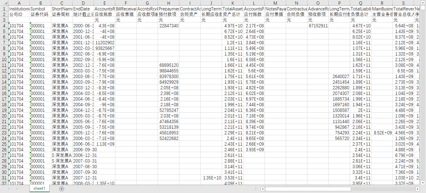 公司ID 证券代码 证券简称 统计截止日期 应收账款 应收票据 应收款项融资 预付款项 合同资产 长期应收款 资产总计 应付账款 应付票据 合同负债 预收款项 长期应付款 负债总计 主营业务收入 营业总收入 净利润 银行借款比例 短期借款依赖度 资产负债率 经营活动产生的现金流量净额/负债合计 筹资活动债权人现金净流量 筹资活动股东现金净流量 经营活动产生的净流量增长率 投资活动产生的现金流量增长率 筹资活动产生的现金流量增长率 可持续增长率 盈利波动性 Zscore Oscore