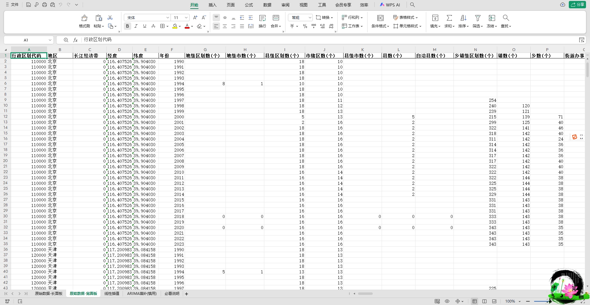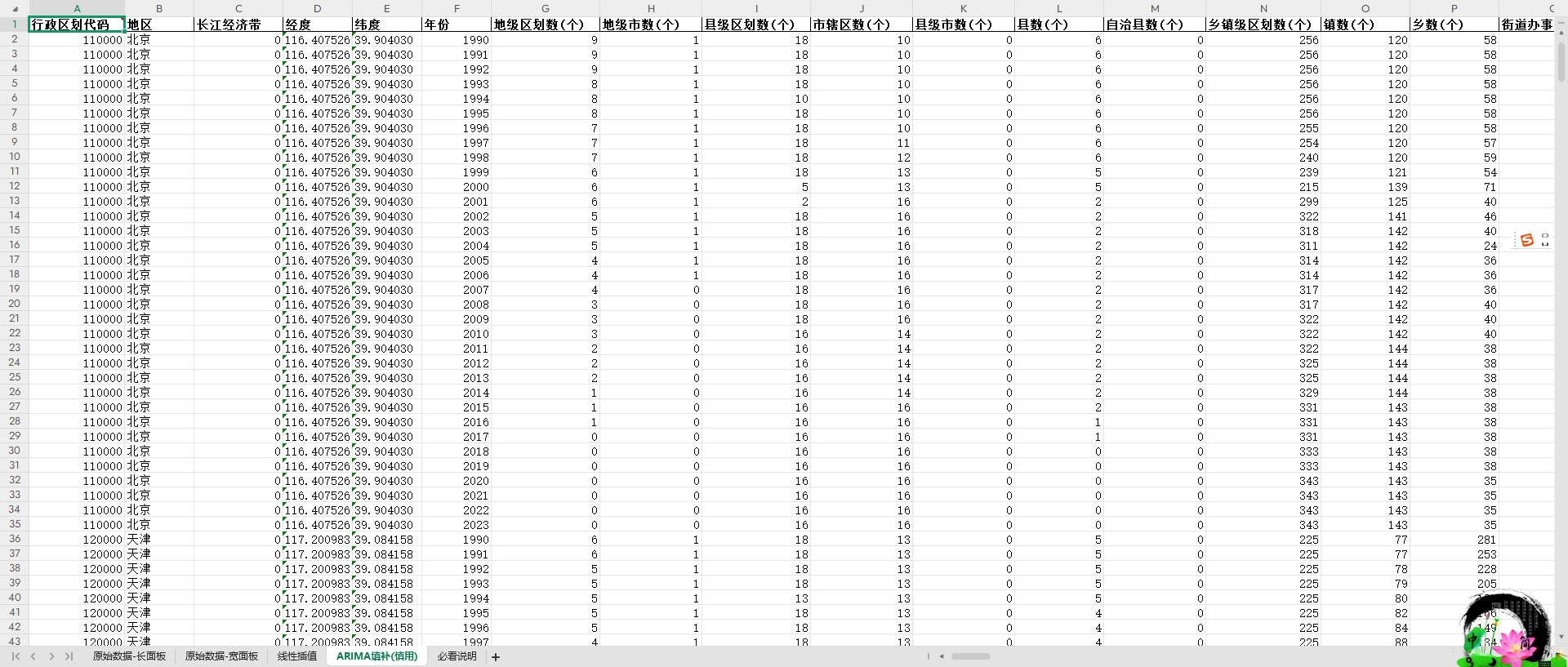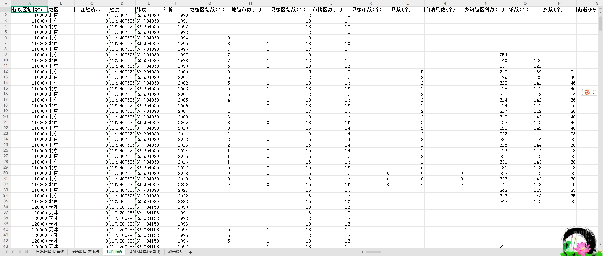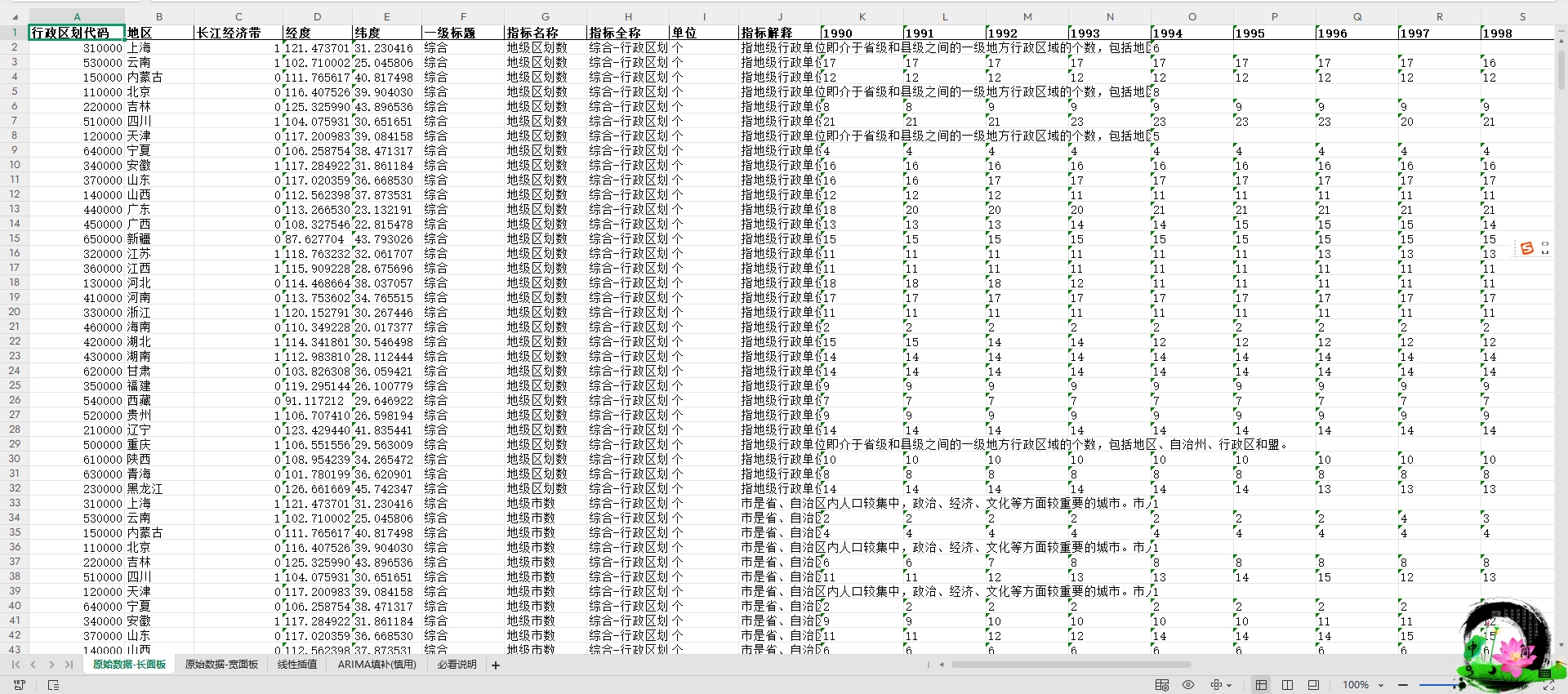 中国省级数据 线性插值、ARIMA填补(平衡面板1990-2023年)