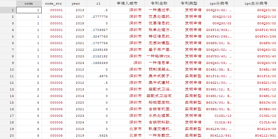 2010-2024突破创新测算结果已匹配上市公司,如图。i1即为突破创新测算结果,code为上市公司代码,突破创新测算参考:突创-突破式创新对分析师行为的影响——上市公司专利分类和引证数据的证据_李哲.pdf,对每个公司专利领域分散度测算,类似赫芬达尔指数。测算结果在匹配到上市公司code上,共45771条数据,非平衡面板,可拿来直接使用。