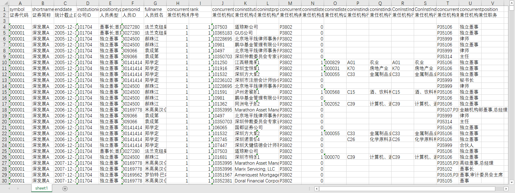 证券代码 证券简称 统计截止日期 公司ID 人员类型 人员ID 人员姓名 兼任机构来源 序号 兼任机构ID 兼任机构名称 兼任机构产权性质 兼任机构类别 兼任机构是否上市公司 兼任机构证券代码 兼任机构行业代码A 兼任机构行业名称A 兼任机构行业代码C 兼任机构行业名称C 兼任机构兼任职务ID 兼任机构兼任职务