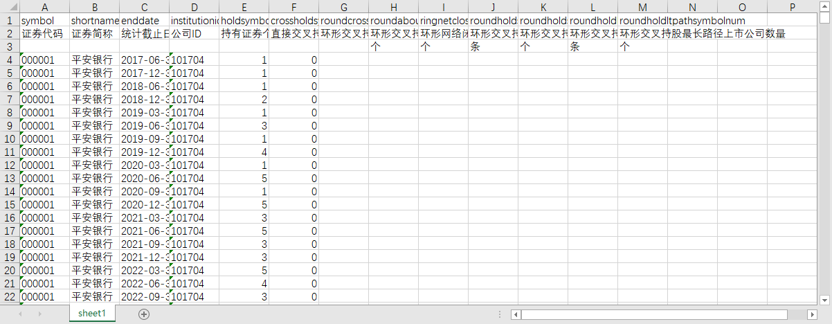 证券代码 证券简称 统计截止日期 公司ID 持有证券个数 直接交叉持股证券个数 环形交叉持股证券代码 环形交叉持股内上市公司总数量 环形网络闭环数 环形交叉持股最短路径链条数 环形交叉持股最短路径上市公司数量 环形交叉持股最长路径链条数 环形交叉持股最长路径上市公司数量