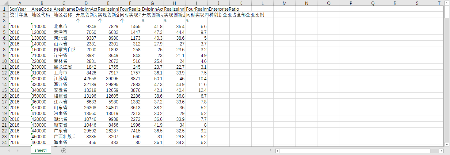 统计年度 地区代码 地区名称 开展创新活动企业数 实现创新企业数 同时实现四种创新企业数 开展创新活动企业占全部企业比例 实现创新企业占全部企业比例 同时实现四种创新企业占全部企业比例