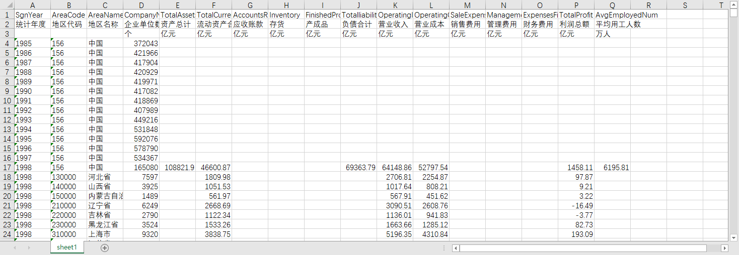 统计年度 地区代码 地区名称 企业单位数 资产总计 流动资产合计 应收账款 存货 产成品 负债合计 营业收入 营业成本 销售费用 管理费用 财务费用 利润总额 平均用工人数