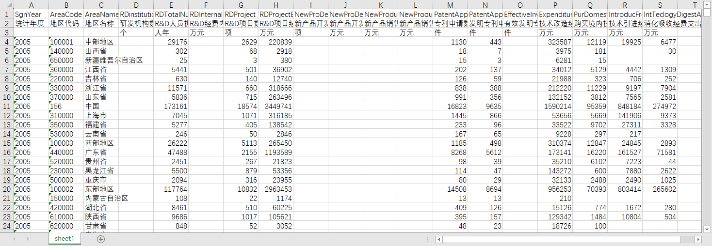 统计年度 地区代码 地区名称 研发机构数 R&D人员折合全时当量 R&D经费内部支出 R&D项目数 R&D项目经费 新产品开发项目数 新产品开发经费支出 新产品销售收入 新产品销售收入-出口 专利申请数 发明专利申请数 有效发明专利数 技术改造经费支出 购买境内技术经费支出 技术引进经费支出 消化吸收经费支出