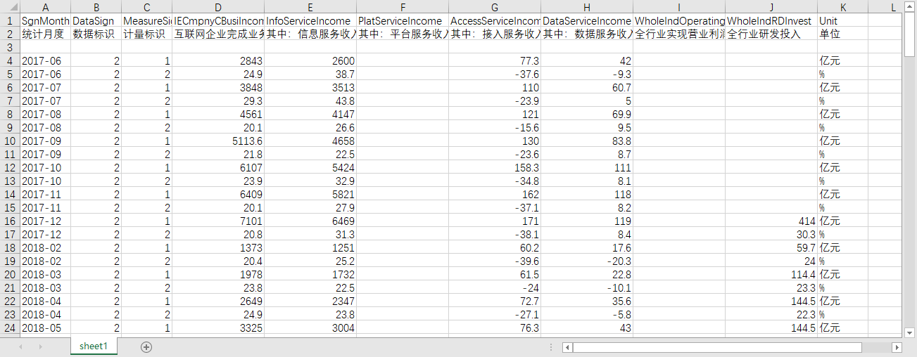 统计月度 数据标识 计量标识 互联网企业完成业务收入 其中:信息服务收入 其中:平台服务收入 其中:接入服务收入 其中:数据服务收入 全行业实现营业利润 全行业研发投入 单位