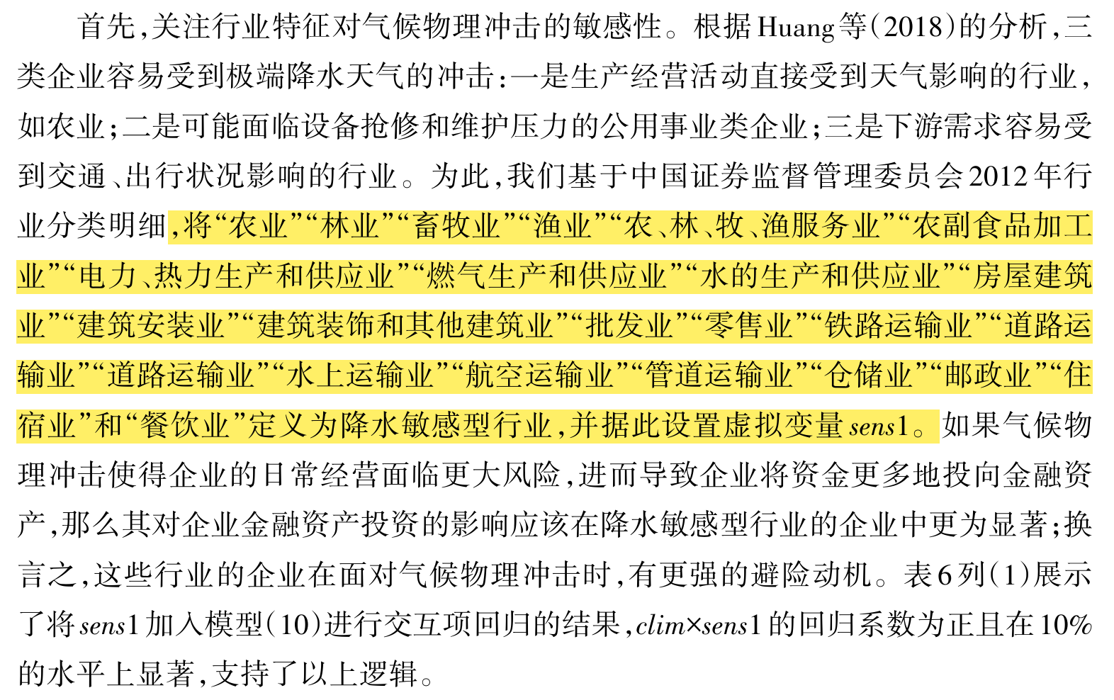 2.测算方式:参考《世界经济》宁博老师(2025)的做法,将“农业”“林业”“畜牧业”“渔业”“农、林、牧、渔服务业”“农副食品加工业”“电力、热力生产和供应业”“燃气生产和供应业”“水的生产和供应业”“房屋建筑业”“建筑安装业”“建筑装饰和其他建筑业”“批发业”“零售业”“铁路运输业”“道路运输业”“道路运输业”“水上运输业”“航空运输业”“管道运输业”“仓储业”“邮政业”“住宿业”和“餐饮业”定义为降水敏感型行业,并据此设置虚拟变量sens1。