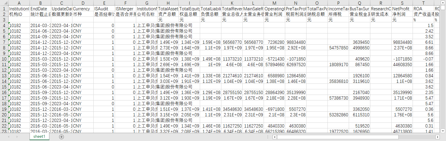 机构ID 统计截止日期 数据更新时间 币种 是否经审计 是否合并报表数据 公司名称 资产总额 权益总额 负债总额 营业总收入 主营业务收入 营业利润 税前利润总额 纳税总额 所得税 营业税金及附加信息 研发成本 净利润 资产收益率 股本收益率 销售收益率 主营业务收入增长率 营业总收入增长率 净利润增长率 总资产增长率