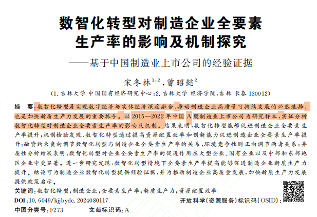 数智化转型是推动数字经济与实体经济深度融合的核心路径,也是实现制造业高质量可持续发展、培育新质生产力的关键抓手。在全球产业竞争加剧的背景下,探明数智化转型对企业全要素生产率(TFP)的作用机制,对优化资源配置、提升产业链韧性具有重要战略意义。