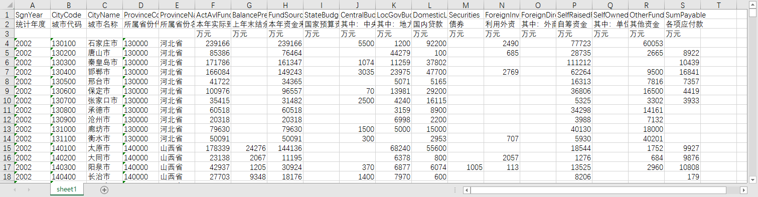 统计年度 城市代码 城市名称 所属省份代码 所属省份名称 本年实际到位资金合计 上年末结余资金 本年资金来源小计 国家预算资金 其中:中央预算资金 其中:地方财政拨款 国内贷款 债券 利用外资 其中:外商直接投资 自筹资金 其中:单位自有资金 其他资金 各项应付款