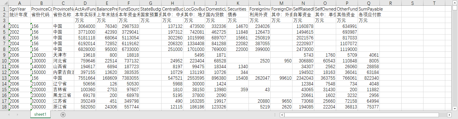 统计年度 省份代码 省份名称 本年实际到位资金合计 上年末结余资金 本年资金来源小计 国家预算资金 其中:中央预算资金 其中:地方财政拨款 国内贷款 债券 利用外资 其中:外商直接投资 自筹资金 其中:单位自有资金 其他资金 各项应付款