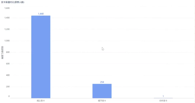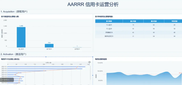 获取用户:从发卡渠道和发卡种类两个维度进行分析,通过柱形图展示不同渠道的获客数量,用分组表呈现发卡种类信息,清晰呈现各渠道和种类的获客差异。