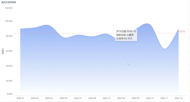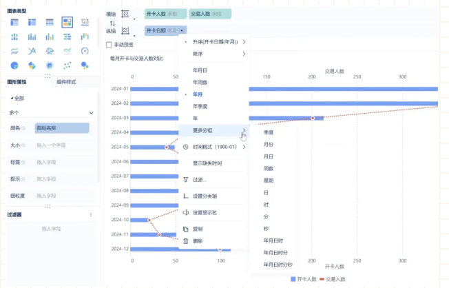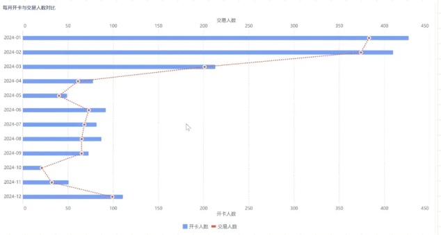 激活用户:设计信用卡交易人数对比和每月交易率趋势两个组件,分别用条形图和折线图的组合图、面积图进行展示。