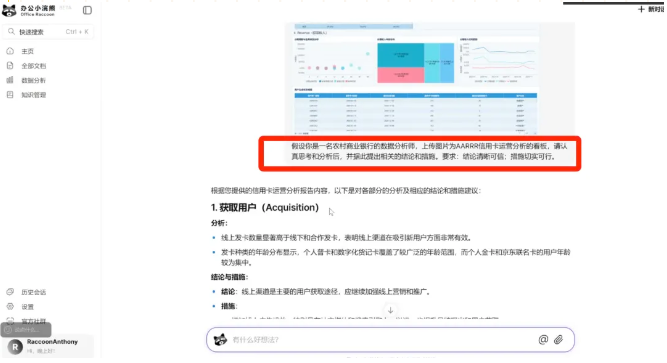 在信用卡运营分析中,AI 发挥着重要作用。很多 AI 工具比如办公小浣熊就很好用,将信用卡运营看板数据输入后,AI 能够从多个方面提出分析结论和改进措施。