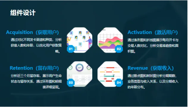 组件设计依据漏斗模型思路展开,分为获取用户、激活用户、留存用户和获取收入4个板块。