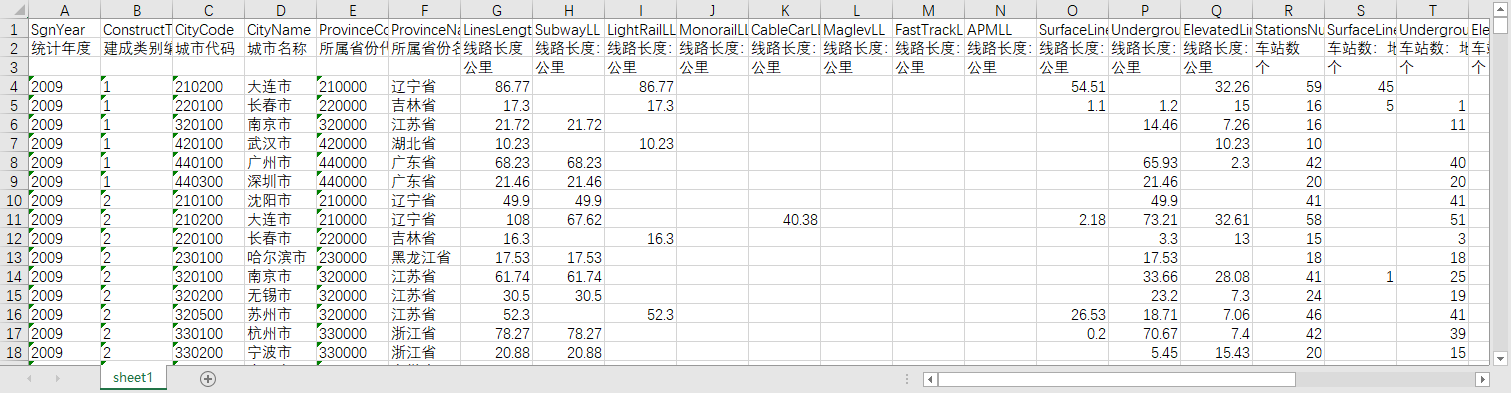 统计年度 建成类别编码 城市代码 城市名称 所属省份代码 所属省份名称 线路长度 线路长度:地铁 线路长度:轻轨 线路长度:单轨 线路长度:有轨 线路长度:磁浮 线路长度:快轨 线路长度:APM 线路长度:地面线 线路长度:地下线 线路长度:高架线 车站数 车站数:地面站 车站数:地下站 车站数:高架站 换乘站数 配置车辆数 配置车辆数:地铁 配置车辆数:轻轨 配置车辆数:单轨 配置车辆数:有轨 配置车辆数:磁浮 配置车辆数:快轨 配置车辆数:APM