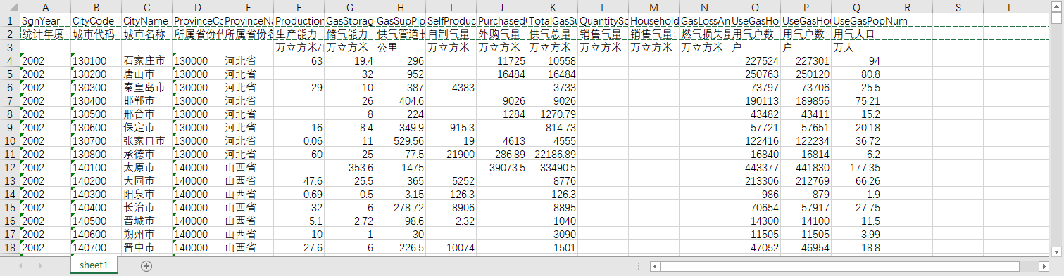 统计年度 城市代码 城市名称 所属省份代码 所属省份名称 生产能力 储气能力 供气管道长度 自制气量 外购气量 供气总量 销售气量 销售气量:居民家庭 燃气损失量 用气户数 用气户数:家庭用户 用气人口