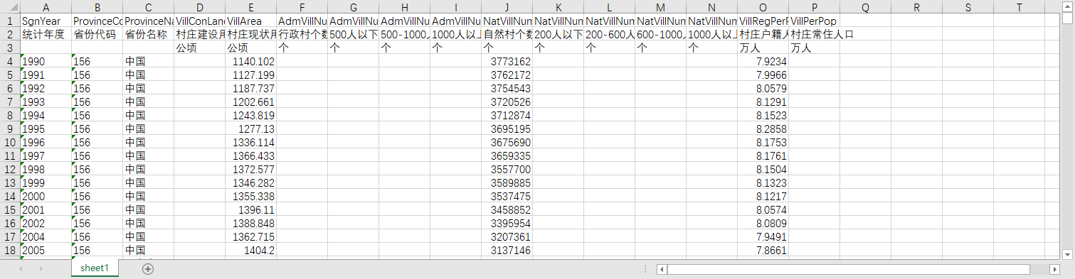 中国全国分省份地区村庄人口及面积情况表(年)1990-2023.zip