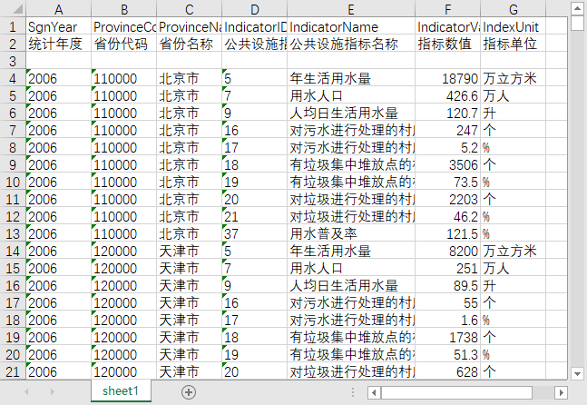| 统计年度 | 省份代码 | 省份名称 | 公共设施指标编码 | 公共设施指标名称 | 指标数值 | 指标单位