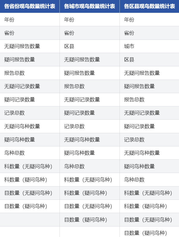 基础统计:年份、省份、城市、区县名称、无疑问/疑问报告数量、记录总数、鸟种总数(含科、目分类)。