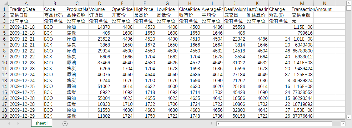 交易日期 商品代码 品种名称 订货量 开市价 最高价 最低价 收市价 平均价 成交量 昨结算价 涨跌(%) 交易金额