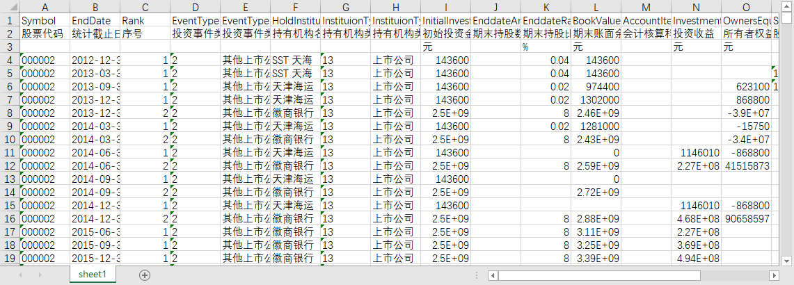 股票代码 统计截止日期 序号 投资事件类型编码 投资事件类型 持有机构名称 持有机构类别编码 持有机构类别 初始投资金额 期末持股数量 期末持股比例 期末账面余额 会计核算科目 投资收益 所有者权益变动额 股份来源编码 股份来源 货币编码 货币类型 说明