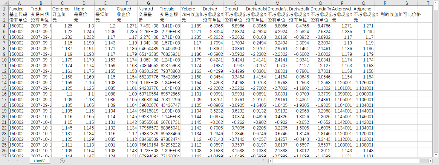 基金代码 交易日期 开盘价 最高价 最低价 收盘价 交易量 交易金额 昨日收盘价 考虑现金红利基金日回报率(%) 不考虑现金红利基金日回报率(%) 考虑现金红利综合指数调整日回报率(%) 不考虑现金红利综合指数调整日回报率(%) 考虑现金红利基金指数调整日回报率(%) 不考虑现金红利基金指数调整日回报率(%) 考虑现金红利的收盘价可比价格 不考虑现金红利的收盘价可比价格