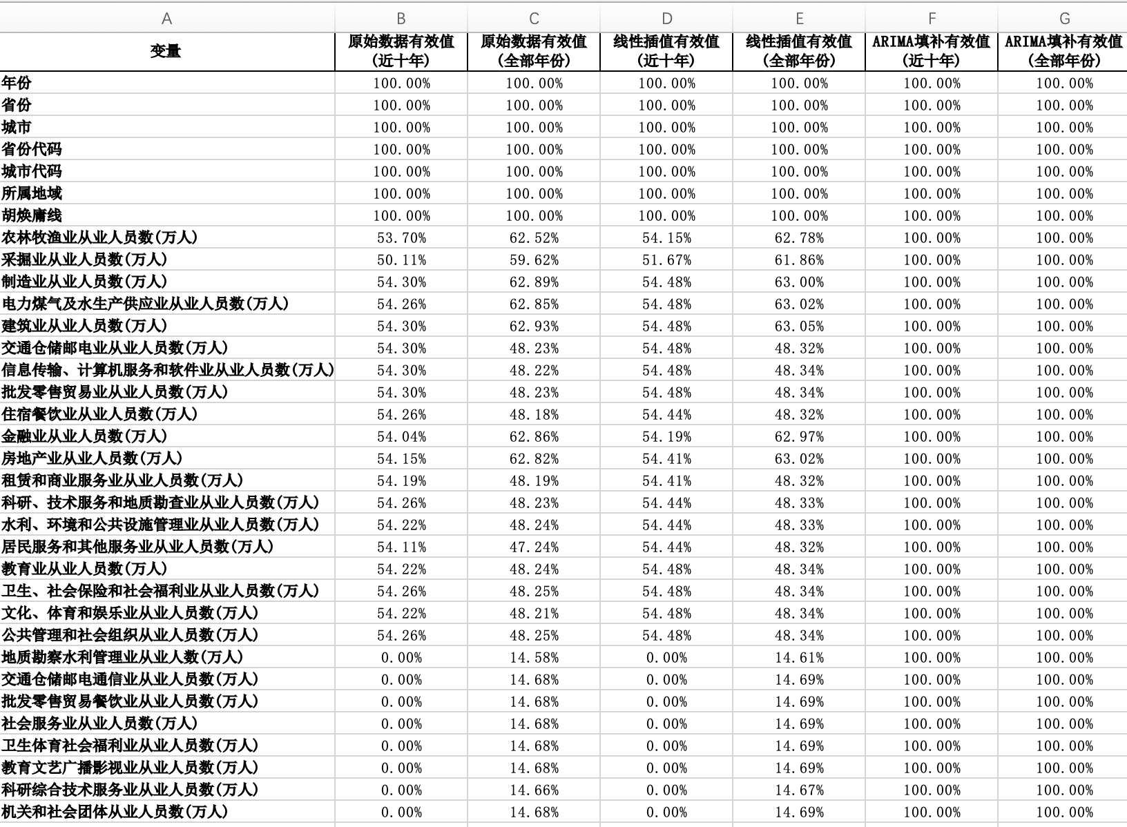 以下是主要变量在三类数据版本中的有效值占比,反映了原始数据的覆盖广度及插值填补后整体可用性的提升情况: