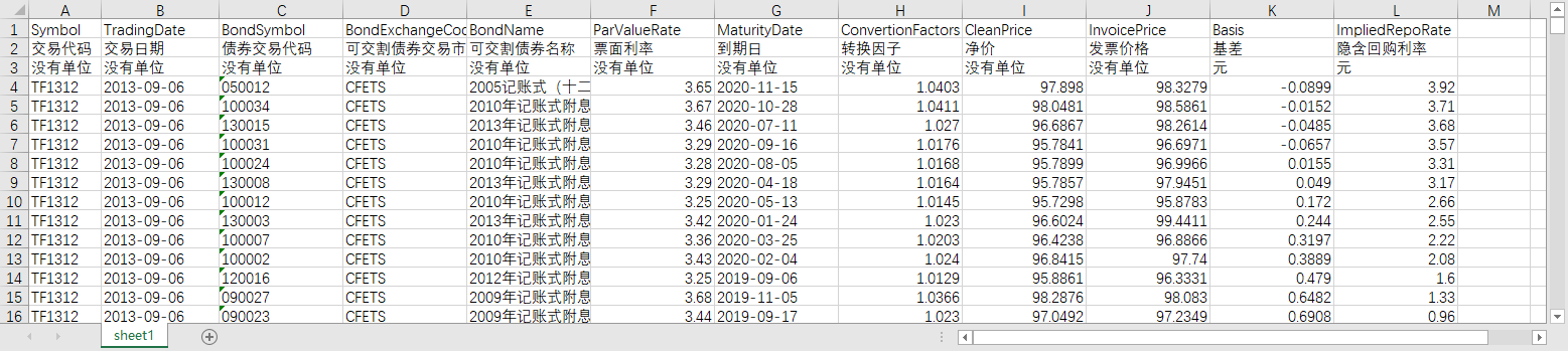 交易代码 交易日期 债券交易代码 可交割债券交易市场 可交割债券名称 票面利率 到期日 转换因子 净价 发票价格 基差 隐含回购利率