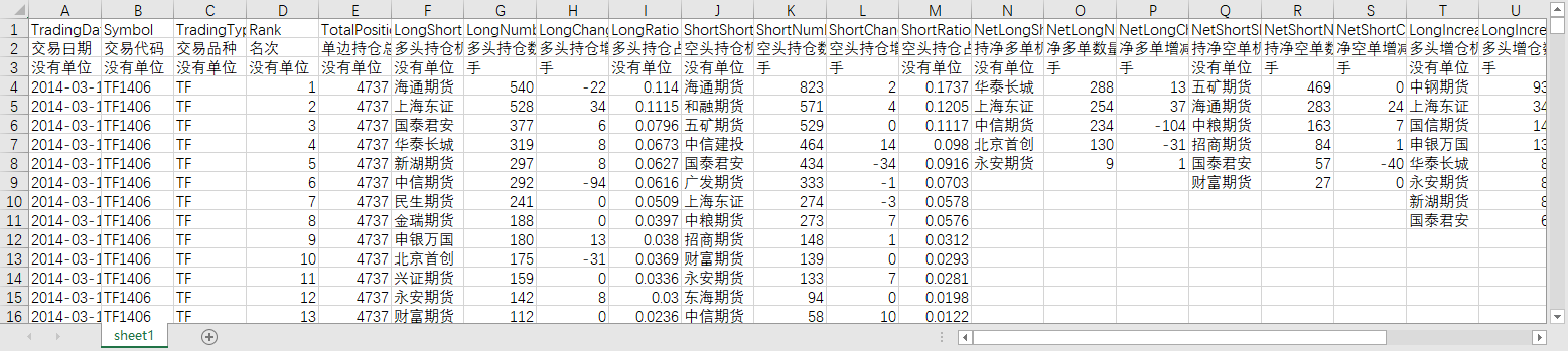 交易日期 交易代码 交易品种 名次 单边持仓总量 多头持仓机构简称 多头持仓数量 多头持仓增减 多头持仓占比(%) 空头持仓机构 空头持仓数量 空头持仓增减 空头持仓占比(%) 持净多单机构 净多单数量 净多单增减 持净空单机构 持净空单数量 净空单增减 多头增仓机构 多头增仓数量 多头减仓机构 多头减仓数量 空头增仓机构 空头增仓数量 空头减仓机构 空头减仓数量