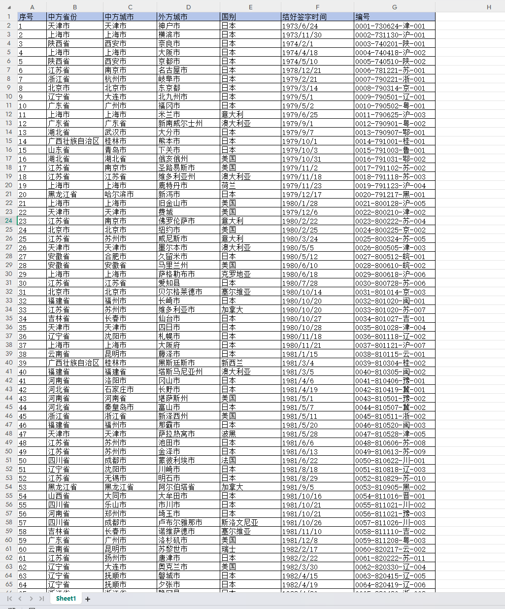 序号、中方省份、中方城市、外方城市、国别、结好签字时间、编号