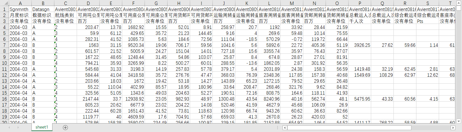 月度标识 数据标识 航线类别 旅客周转量收费客公里 旅客周转量收费客公里同比增长(%) 运输周转量收费吨公里 运输周转量收费吨公里同比增长(%) 货邮周转量收费吨公里—货邮运 货邮周转量收费吨公里—货邮运同比增长(%) 可利用客公里 可利用客公里同比增长(%) 可利用吨公里 可利用吨公里同比增长(%) 可利用吨公里—货邮运 可利用吨公里—货邮运同比增长(%) 载客人次 载客人次同比增长(%) 货运及邮运量 货运及邮运量同比增长(%) 客座率(%) 客座率同比增长 总体载运率(%) 总体载运率同比增长