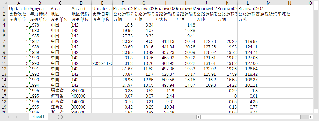 更新次数 年度标识 地区 地区代码 更新日期 公路运输汽车辆数总计 公路运输载客汽车辆数 公路运输载客汽车客位 公路运输载货汽车辆数 公路运输载货汽车吨位 公路运输普通载货汽车辆数 公路运输普通载货汽车吨数