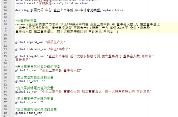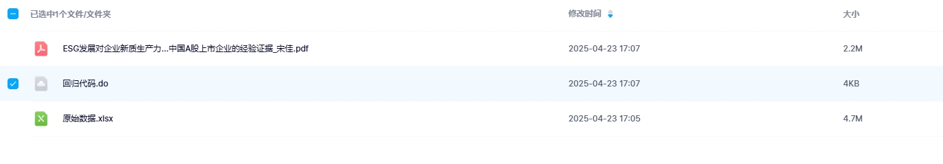 ESG发展理念已成为企业可持续发展的重要标志,不仅为包括低碳技术在内的新兴技术提供新的驱动力,也为企业生产力的提升注入了新的技术动能。因此,研究企业ESG发展对新质生产力的影响,对于推动经济高质量发展具有重要的现实意义。参照宋佳(2024)的做法,对《ESG发展对企业新质生产力影响的研究——来自中国A股上市企业的经验证据》一文中的基准回归部分进行复刻,包括原始数据、dofile、基准回归结果。