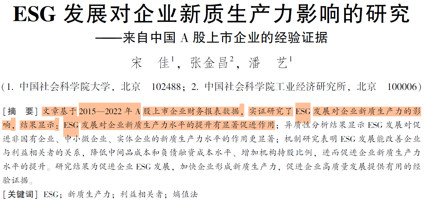 宋佳,张金昌,潘艺.ESG发展对企业新质生产力影响的研究——来自中国A股上市企业的经验证据[J].当代经济管理,2024,46(06):1-11.