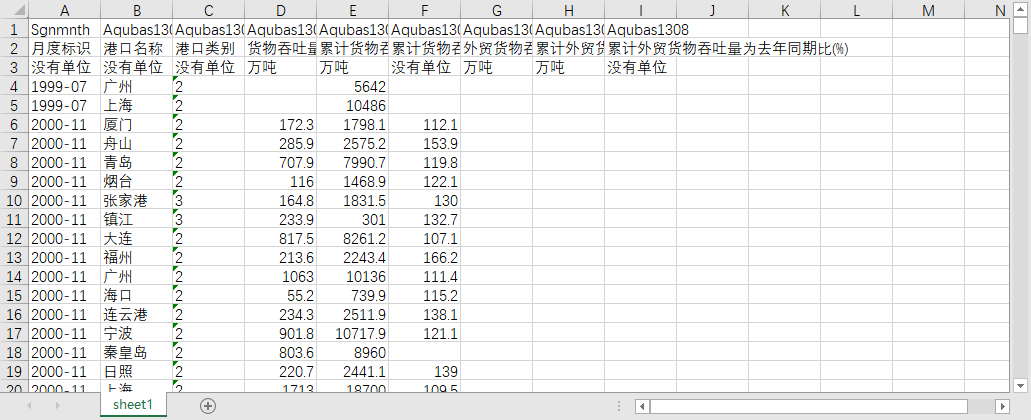 | 月度标识 | 港口名称 | 港口类别 | 货物吞吐量 | 累计货物吞吐量 | 累计货物吞吐量为去年同期比(%) | 外贸货物吞吐量 | 累计外贸货物吞吐量 | 累计外贸货物吞吐量为去年同期比(%) |