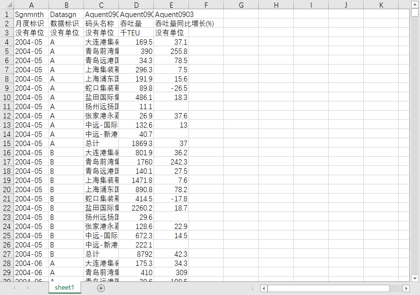 | 月度标识 | 数据标识 | 码头名称 | 吞吐量 | 吞吐量同比增长(%) |