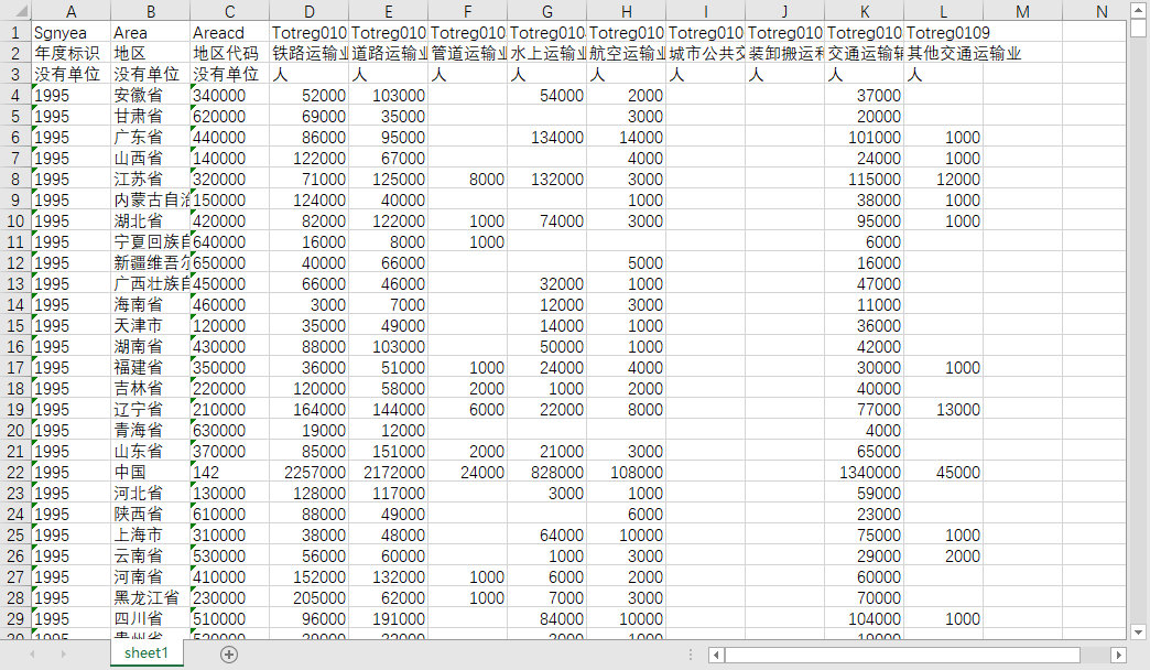 省份地区交通运输业职工人数1995-2023铁路道路管道水上航空城市公共交通业装卸搬运和