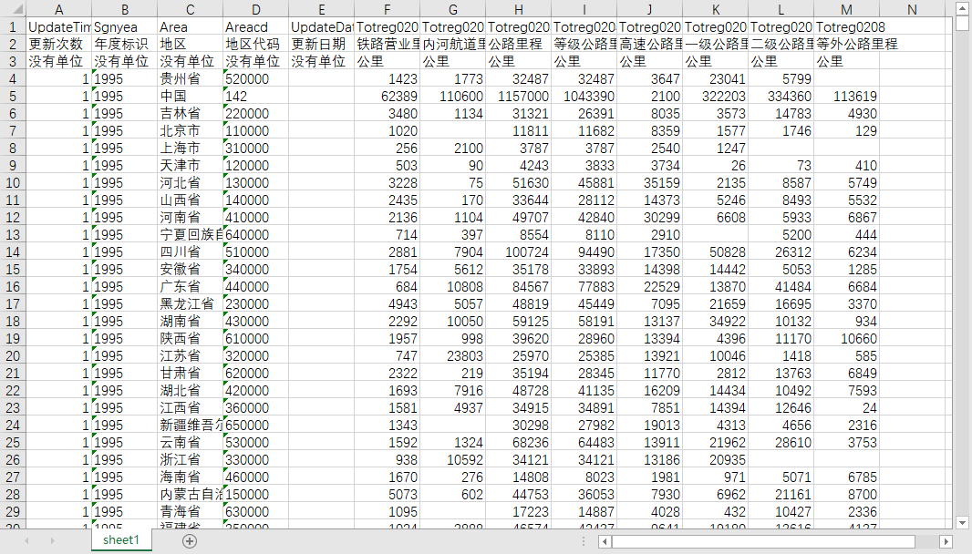 更新次数 年度标识 地区 地区代码 更新日期 铁路营业里程 内河航道里程 公路里程 等级公路里程 高速公路里程 一级公路里程 二级公路里程 等外公路里程