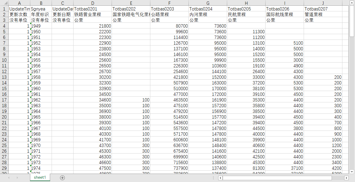 年度标识 铁路营业里程 国家铁路电气化里程 公路长度 高速公路长度 内河长度 民航长度 国际航线长度 管道长度 客运量总计 铁路客运量 国家铁路客运量 地方铁路客运量 合资铁路客运量 公路客运量 水运客运量 民用航空客运量 旅客周转量总计 铁路旅客周转量 国家铁路旅客周转量 地方铁路旅客周转量 合资铁路旅客周转量 公路旅客周转量 水运旅客周转量 民用航空旅客周转量 货运量总计 铁路货运量 国家铁路货运量 地方铁路货运量 合资铁路货运量 公路货运量 水运货运量 民用航空货运量 管道货运量 货物周转量总计 铁路货物周转量 国家铁路货物周转量 地方铁路货物周转量 合资铁路货物周转量 公路货物周转量 水运货物周转量 民用航空货物周转量 管道货物周转量 民用汽车拥有量 载客汽车 载货汽车 普通载货汽车 公路部门营运汽车 私人汽车 其他机动车拥有量 民用机动船 民用驳船 私人机动船 私人驳船 沿海主要港口货物吞吐量