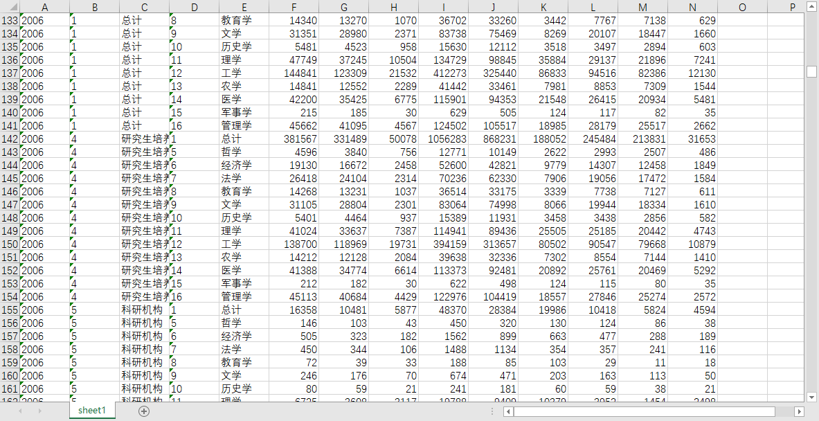 | 统计年度 | 教育分类编码 | 教育分类名称 | 研究生分科编码 | 研究生分科名称 | 招生数 | 硕士招生数 | 博士招生数 | 在校学生数 | 硕士在校生数 | 博士在校生数 | 毕业生数 | 硕士毕业生数 | 博士毕业生数 |