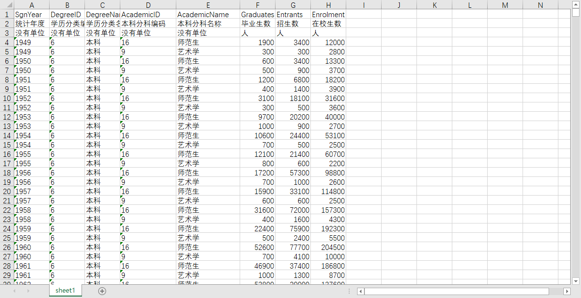 | 统计年度 | 学历分类编码 | 学历分类名称 | 本科分科编码 | 本科分科名称 | 毕业生数 | 招生数 | 在校生数 |