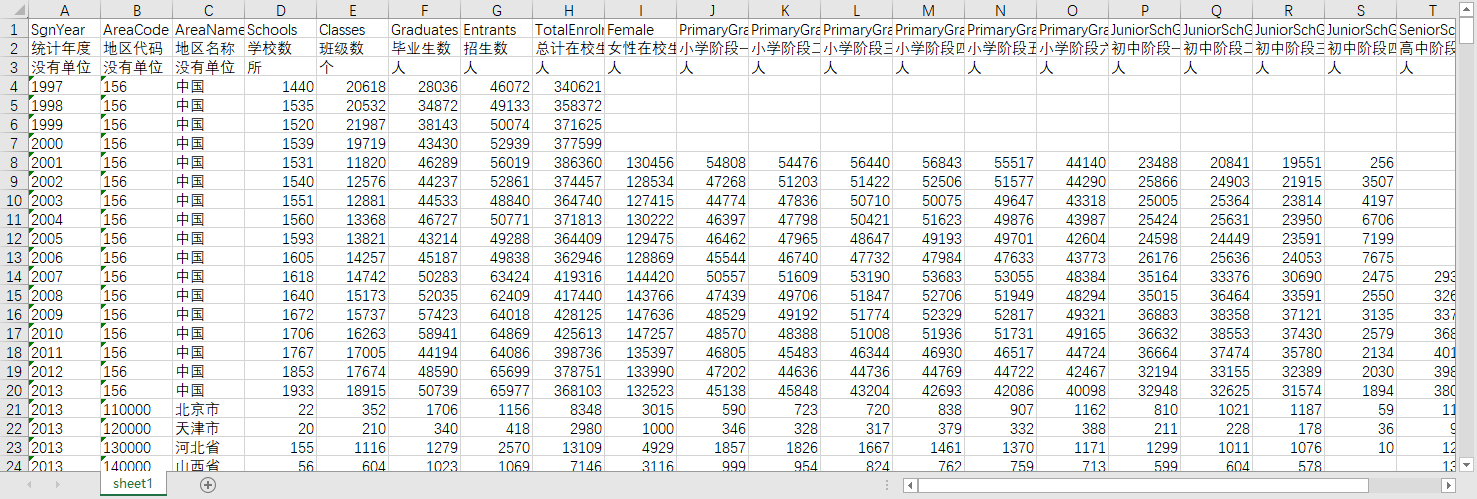 统计年度 地区代码 地区名称 学校数 班级数 毕业生数 招生数 总计在校生数 女性在校生 小学阶段一年级在校生 小学阶段二年级在校生 小学阶段三年级在校生 小学阶段四年级在校生 小学阶段五年级在校生 小学阶段六年级在校生 初中阶段一年级在校生 初中阶段二年级在校生 初中阶段三年级在校生 初中阶段四年级在校生 高中阶段一年级在校生 高中阶段二年级在校生 高中阶段三年级及以上在校生(%)