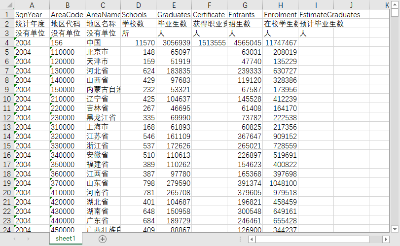 统计年度 地区代码 地区名称 学校数 毕业生数 获得职业资格证书 招生数 在校学生数 预计毕业生数
