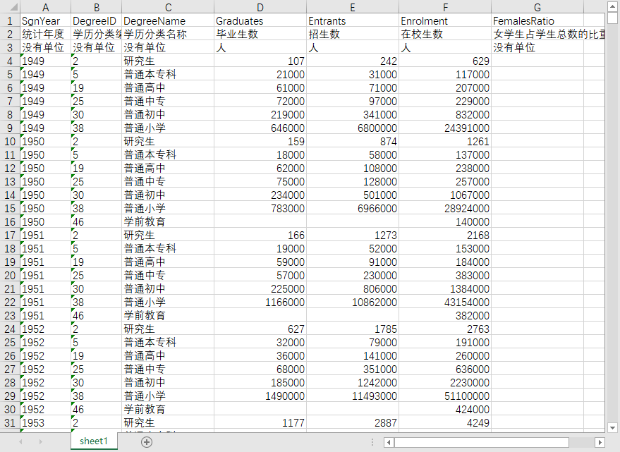 | 统计年度 | 学历分类编码 | 学历分类名称 | 毕业生数 | 招生数 | 在校生数 | 女学生占学生总数的比重(%) |