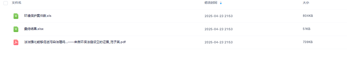 4. 参考文献范子英, 赵仁杰. 法治强化能够促进污染治理吗?——来自环保法庭设立的证据[J]. 经济研究, 2019, 54(03): 21 - 37.