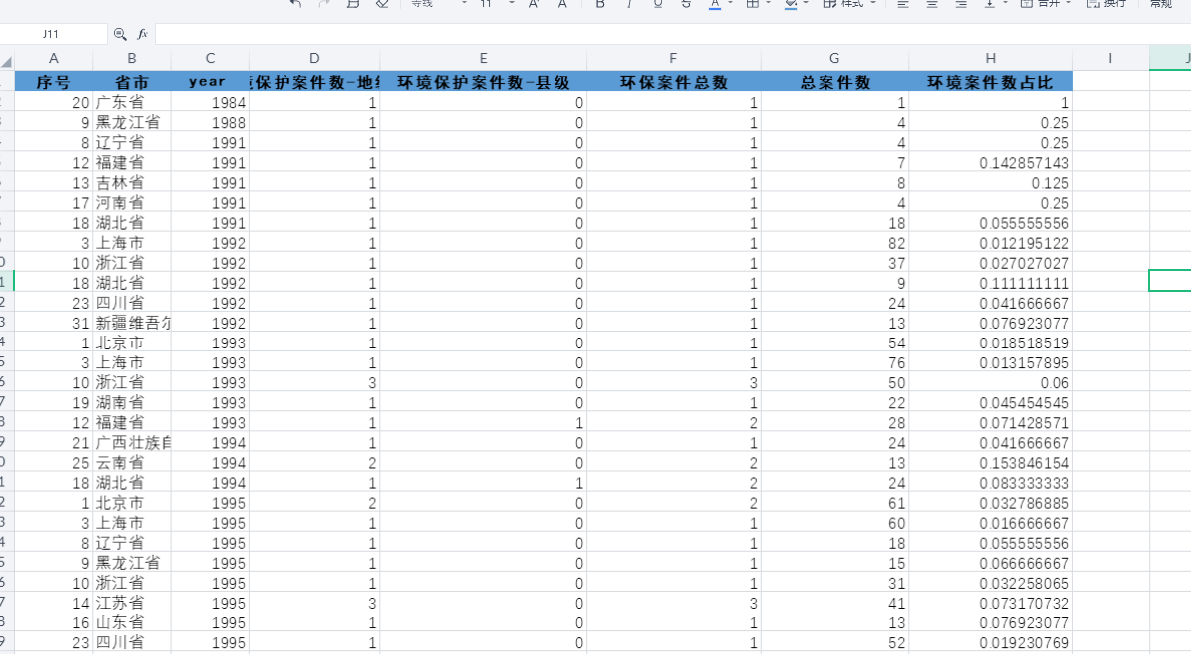 - 环境污染责任纠纷案件占所有侵权责任纠纷案件的比重(percent):体现该类案件在地区司法审理中的相对重要程度。
