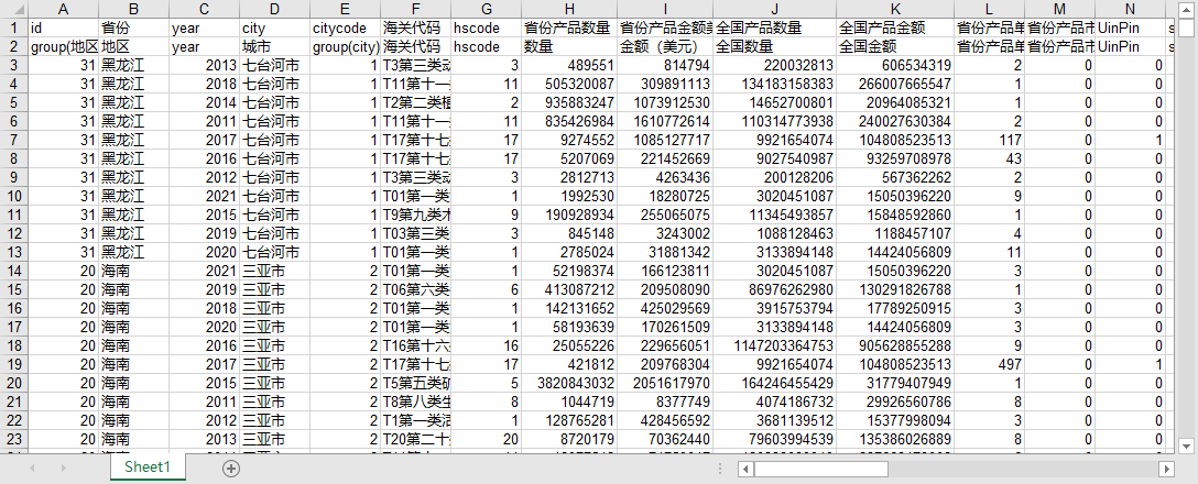 group(地区) 地区 year 城市 group(city) 海关代码 hscode 数量 金额(美元) 全国数量 全国金额 省份产品单位价格 省份产品市场份额 UinPin sum_UinPin 省份产品粗略出口质量 省份总出口额 Xic/Xc(省份产品金额美元/省份总出口额) sum_Xic_Xc Xic_Xc_sum_Xic_Xc pgdp 产品出口技术复杂度 qualityics qualityic 省份出口产品质量 Xic_Xc乘以PRODYi 省份出口技术复杂度(对Xic_XcPRODYi求和) 第三产业增加值占GDP比重(%) 地级市出口产品质量 地级市出口技术复杂度