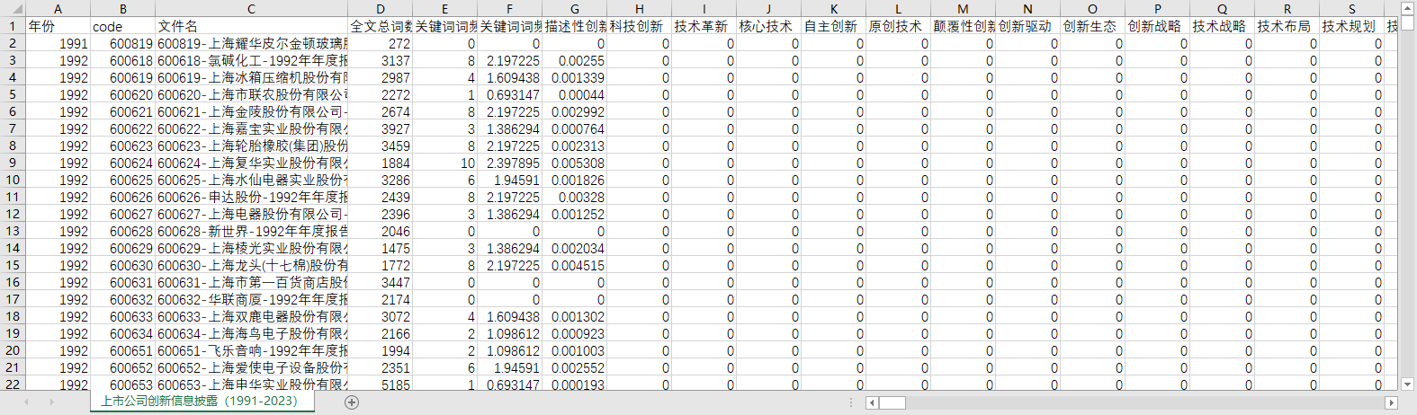 年份 code 文件名 全文总词数 关键词词频数 关键词词频数的自然对数 描述性创新水平 科技创新 技术革新 核心技术 自主创新 原创技术 颠覆性创新 创新驱动 创新生态 创新战略 技术战略 技术布局 技术规划 技术路线 技术突破 技术壁垒 研发投入 研发成果 研发管理 自主研发 联合研发 研发平台 研发体系 研发能力 研发计划 研发进展 研发协作 研发流程 研发评估 研发优化 研发标准 发明专利 实用新型 外观专利 专利授权 专利布局 知识产权 专利转化 专利分析 专利合作 技术秘密 版权保护 商标注册 著作权 知识产权管理 专利资产 工艺技术 产品技术 前沿技术 先进技术 智能制造 绿色技术 数字化技术 技术升级 技术改造 技术集成 技术转化 技术转移 技术合作 技术攻关 技术成熟度 试生产 量产工艺 生产优化 工艺改进 质量控制 BS 精密制造 柔性制造 数字化制造 自动化生产 产能提升 良率改善 供应链技术 工艺标准化 生产效能